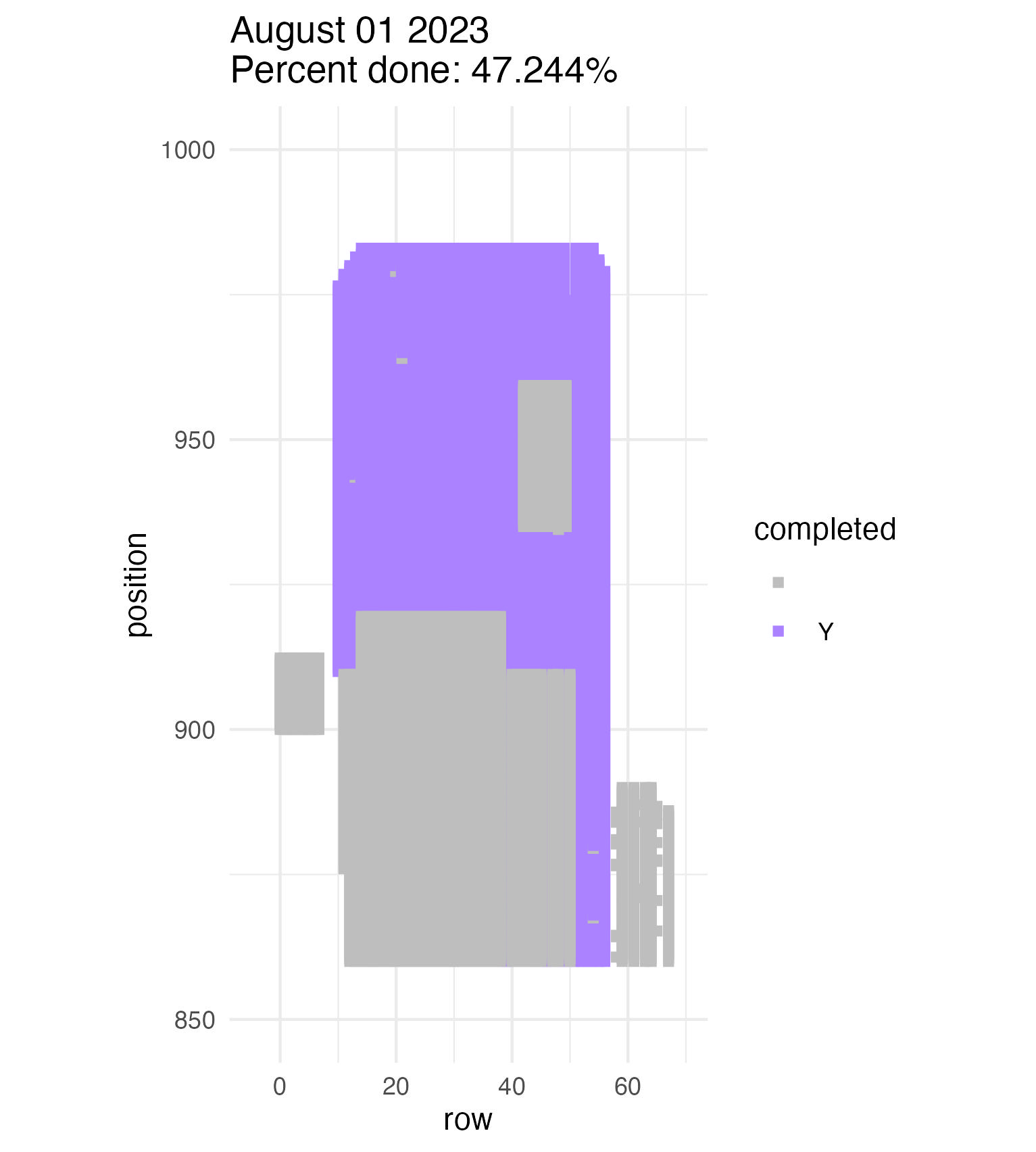 A map of every position in p1. Every position we have visited so far is colored in purple. On Friday, we were 8.1% done with measuring the plot. After today, we jumped up to 23.8% done. Rounding up, that’s about a quarter of the plot done already! Yahoo!