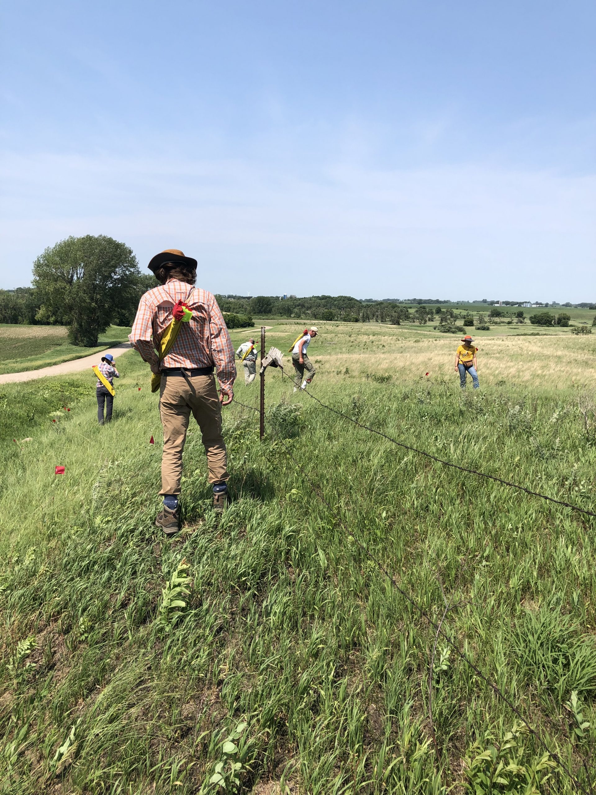 The first part of the morning started off by gathering the materials needed to flag and to record data on each echinacea plant in the remnants areas. We gathered red and neon flags, zip ties, our visors, metal tags, and our flag bags. We headed out to the remnants area and listened to Jared explain to our small group on how to walk and things to look out for when we were walking around. The group and I were searching for more echinacea plants and flagging them with red flags on the North side of each plant and leaning the flag to the East. we found 44 on the East side.