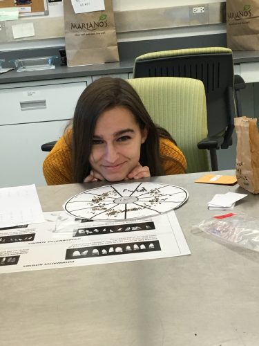 On the other hand, Nina moved on to randomizing today to prepare her samples for x-raying, which she admits was a more tedious task than she had initially anticipated. But she is very enamored with her randomization wheel that she has so much that it makes up for the meticulous task it is (see exhibit A to the left). She finished about half of her bags and reports feeling “hatisfied” with her progress. She hopes to be done by tomorrow so she can prepare het sheets for x-raying for Wednesday. She also reports that she is looking forward to counting because it is a beautiful, non thought-provoking task.