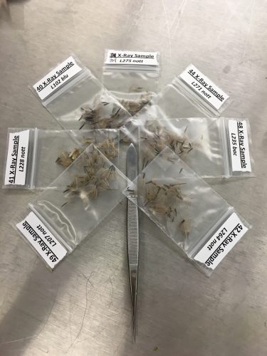 My buds are much less stubborn and the achenes easily fall off. In fact, my buds actually look quite different from the echinacea achenes, resembling a miniature version of the capitulum often emitted from dandelions, making them quite fun to work with! Pictured to the right, these are the achenes I separated into baggies for future x-raying (notice the formation!)